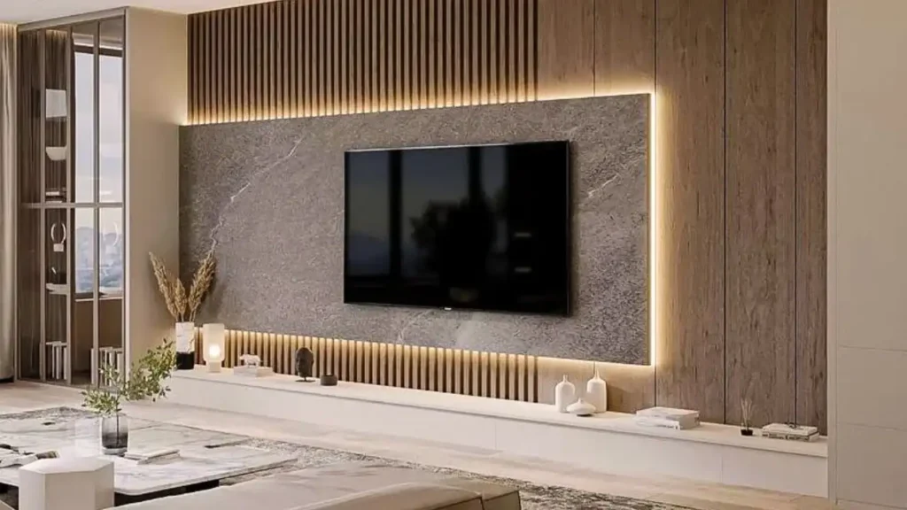 Experience the beauty of the TV unit system with PU concrete or WPC wall panels with integrated LED channels. You enjoy the crisp texture of the wall panel décor with the ambient LED lighting. We install shelves, a console table, and an accent backsplash wall panel in marble or bespoke designs. The high-grade LED improves the visual appeal and provides mood lighting in the living rooms or hotel suites.
